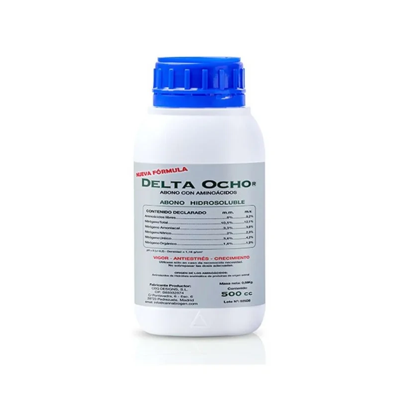 DELTA OCHO actúa en fase de crecimiento como activador de los procesos naturales del metabolismo del cannabis, SIN ALTERARLO, incrementando una actividad enzimática y proteína muy específica y determinante para el desarrollo vegetativo.