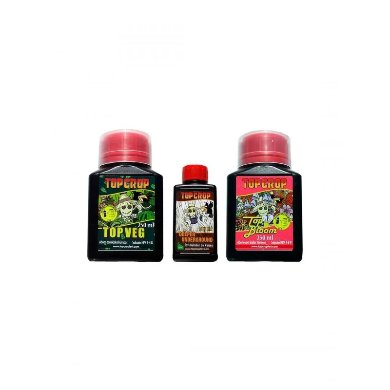 TriPack de Top Crop son productos para enraizamiento, crecimiento, y floración de tus plantas. Con este pack básico se ofrece a los usuarios una solución global para probar la marca o asumir cultivos a su medida sin necesidad de adquirir mayor cantidad de producto. El pack está compuesto por: