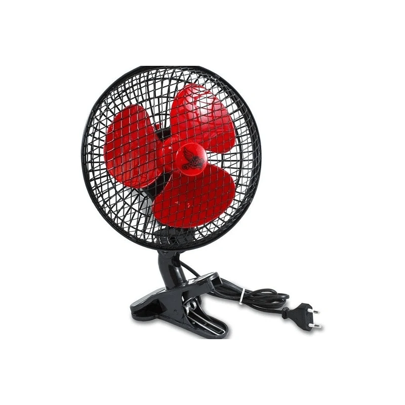 Una revolución entre los pequeños ventiladores con pinza en el mercado, por ser el primero de ellos oscilante. Este modelo, gracias a su sistema de cabezal giratorio, permite una mejor circulación de aire con un movimiento de ventilación oscilante de casi 180º. Diseño en negro como el resto de productos de la familia Cyclone pero con aspas de color rojo para diferenciarlo del ventilador Cyclone con pinza normal. Es realmente el ventilador ideal para los armarios de cultivo.